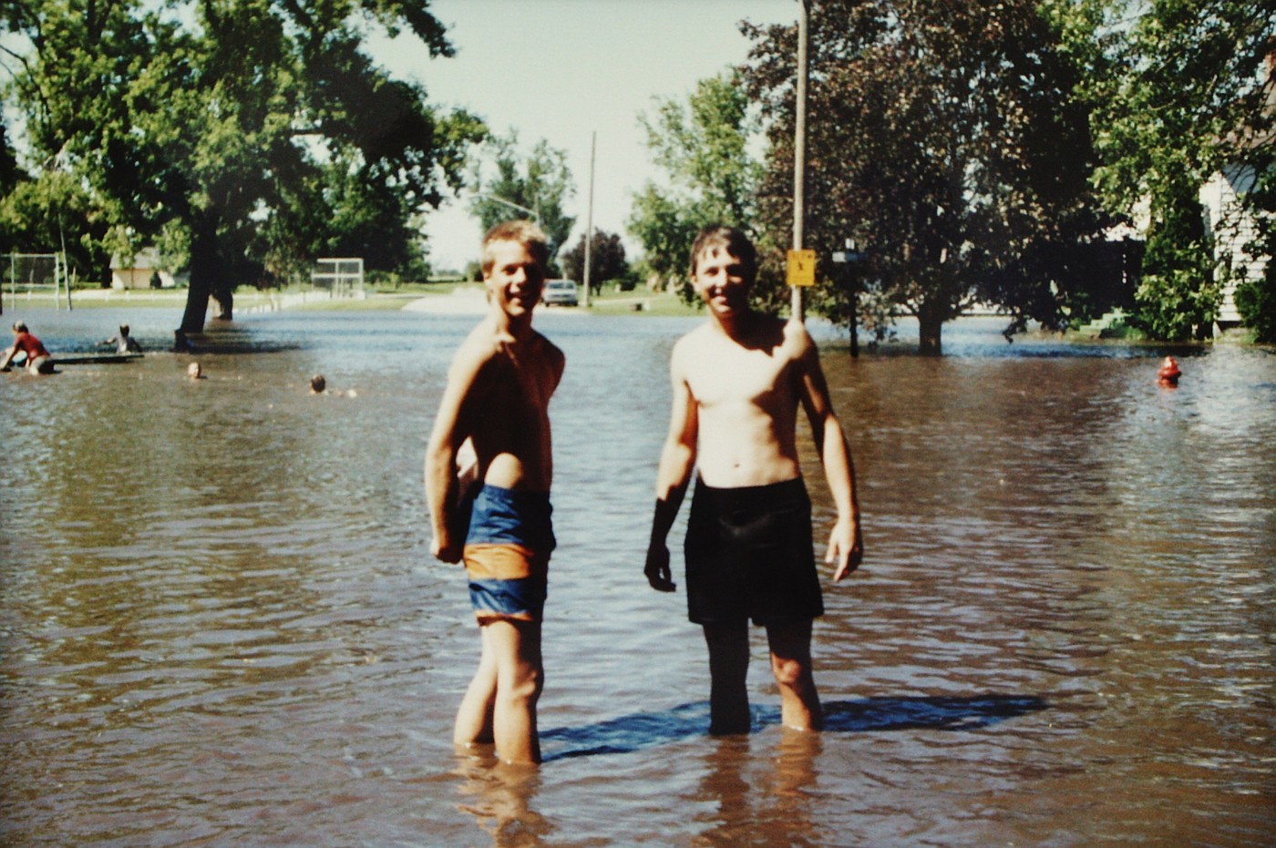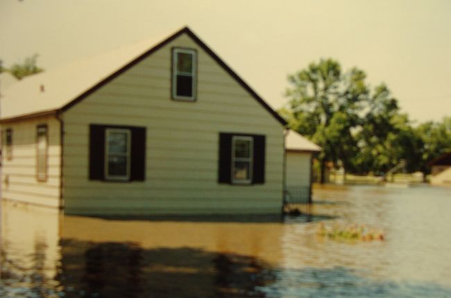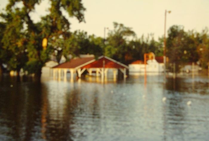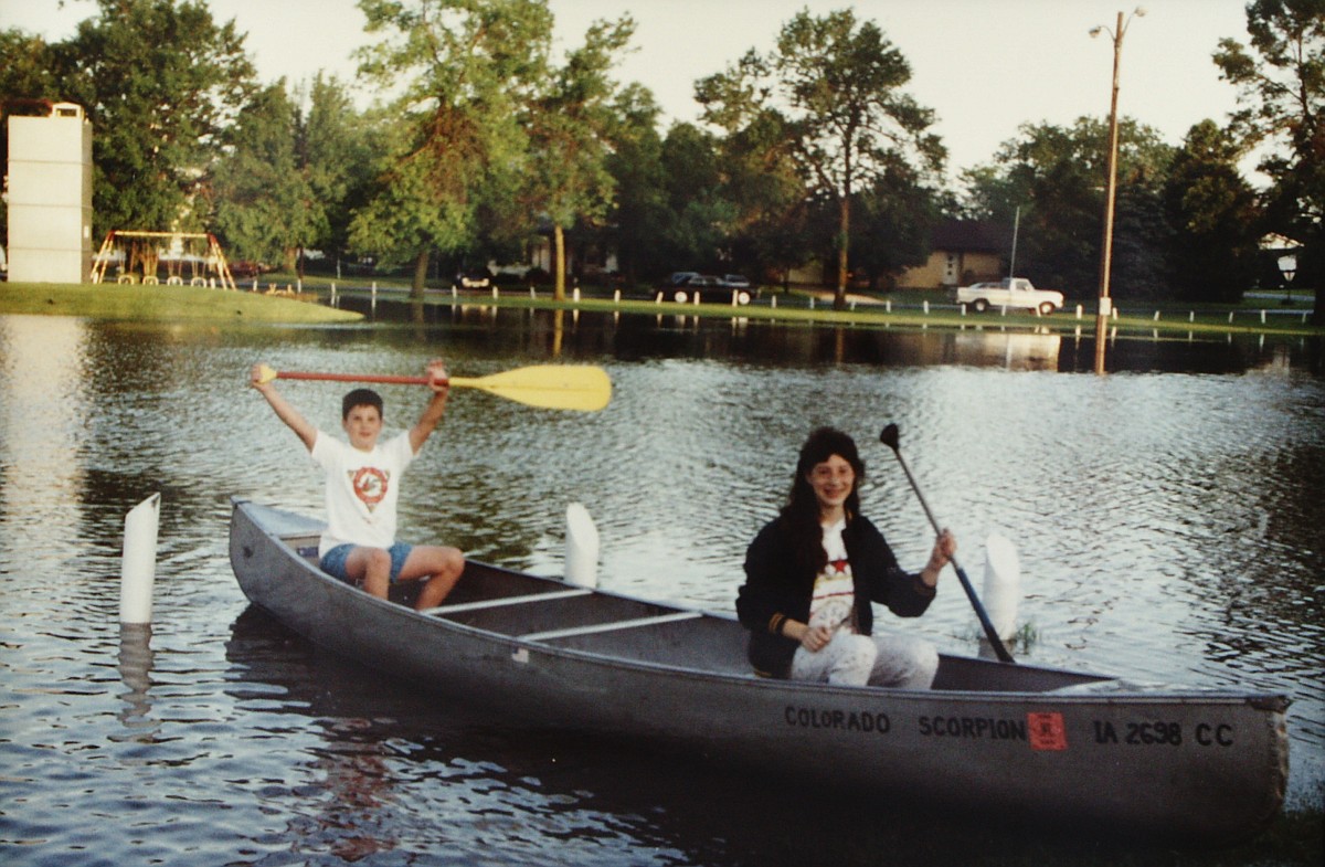 See evidence of the 29 inch water level that was found in the basement of the Ellsworth United Methodist Church. If you are supposed to deliver the Des Moines Register, the Ames Tribune, and the South Hamilton Record News during the worst days of 1993, what could you do? Well, instead of delaying what folks expected or missing the deadline, you could just deliver by canoe! Sara and Wayne are pictured doing that in this photo. This image shows the Skunk River, heading South from the Highway 175 bridge. the Skunk River, coming South towards the Highway 175 bridge.