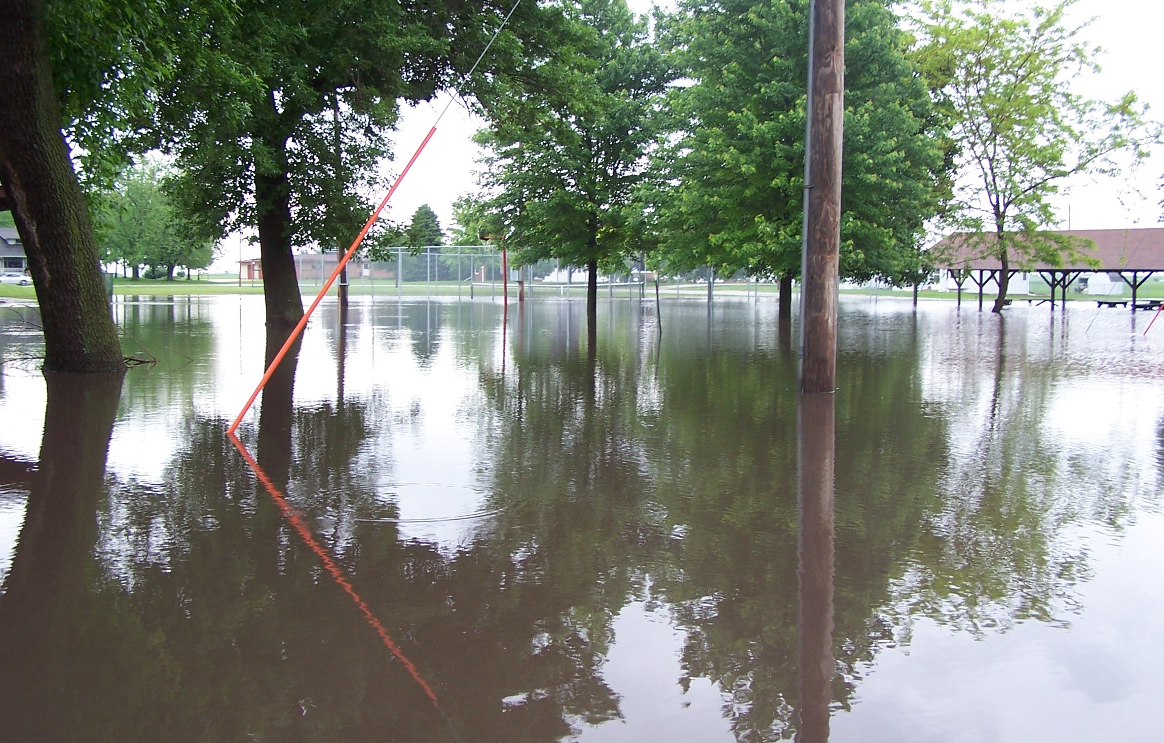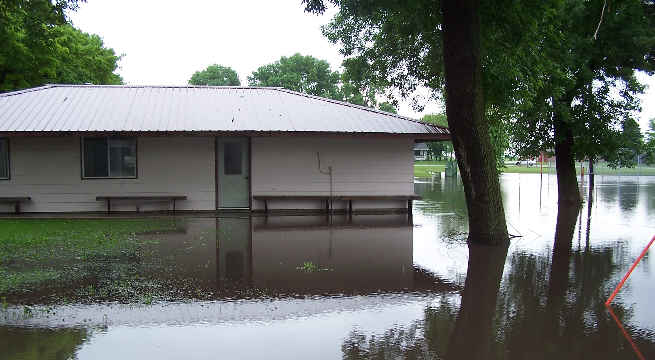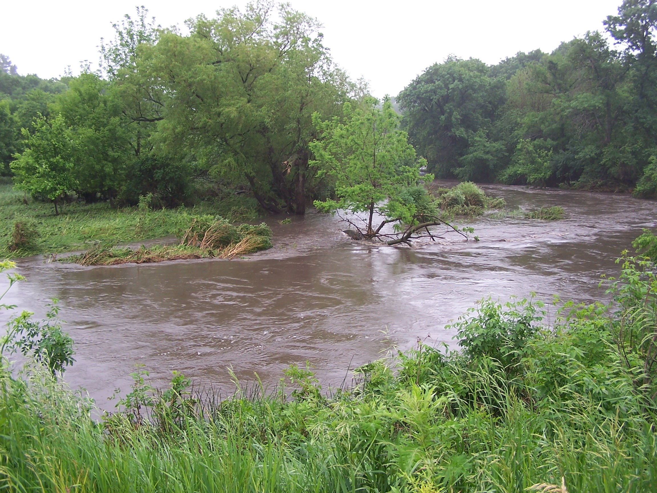 See evidence of the 29 inch water level that was found in the basement of the Ellsworth United Methodist Church. If you are supposed to deliver the Des Moines Register, the Ames Tribune, and the South Hamilton Record News during the worst days of 1993, what could you do? Well, instead of delaying what folks expected or missing the deadline, you could just deliver by canoe! Sara and Wayne are pictured doing that in this photo. This image shows the Skunk River, heading South from the Highway 175 bridge. the Skunk River, coming South towards the Highway 175 bridge.