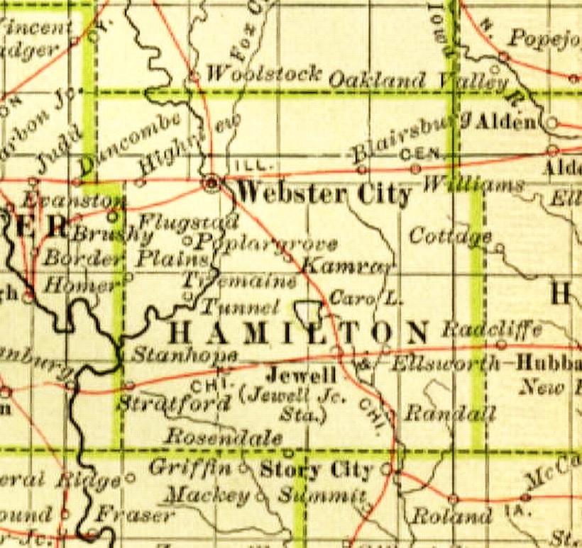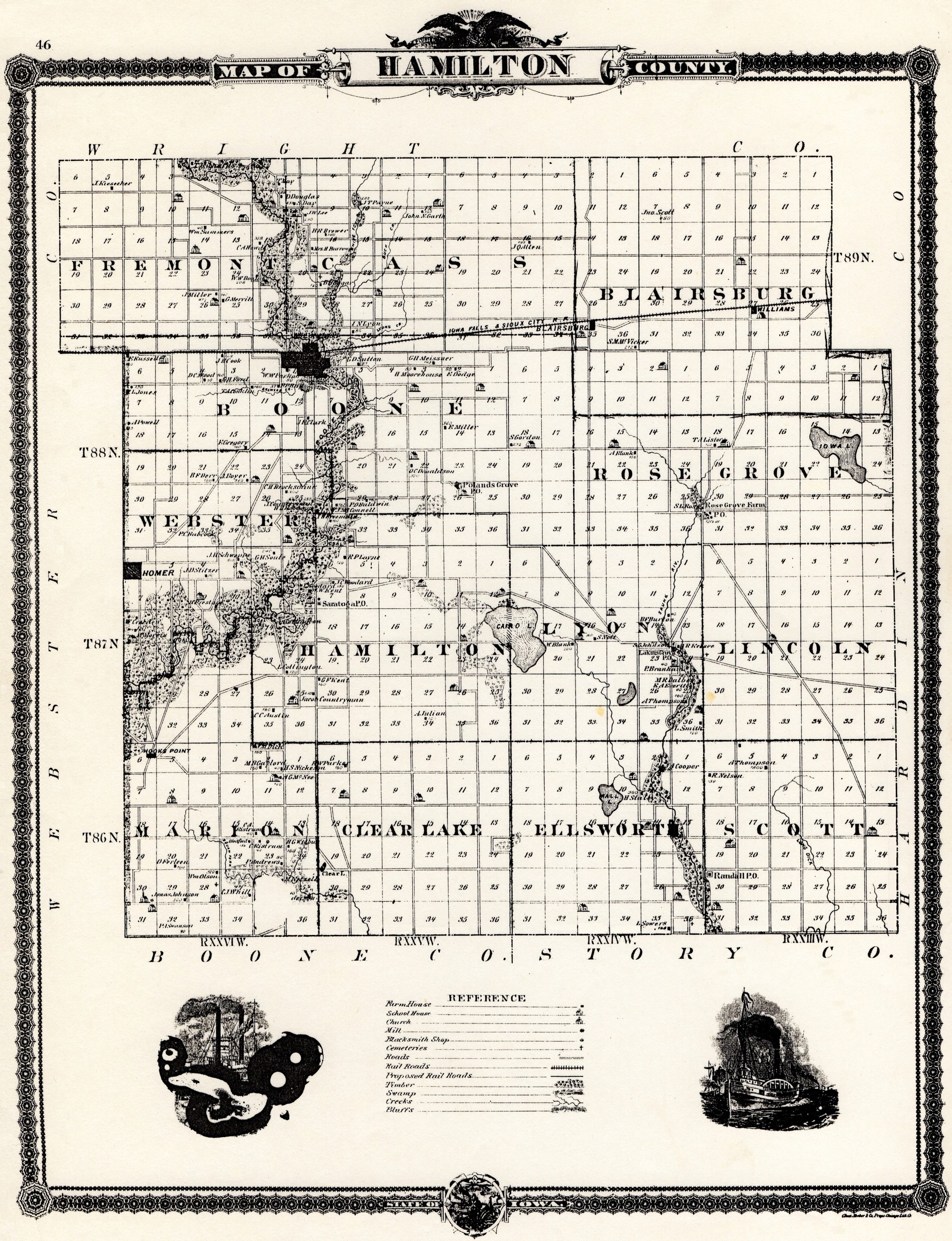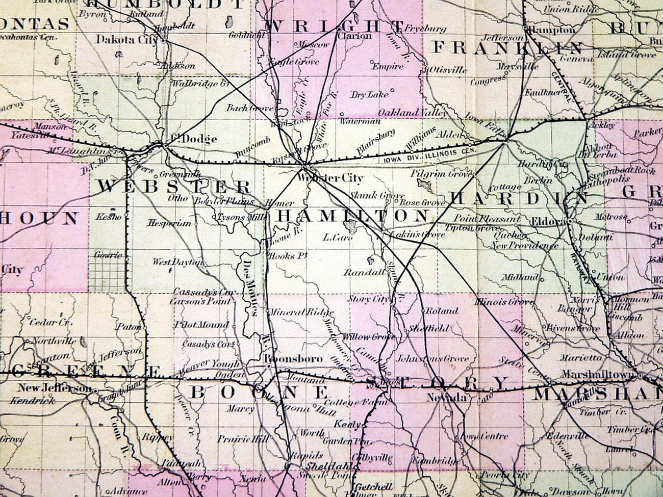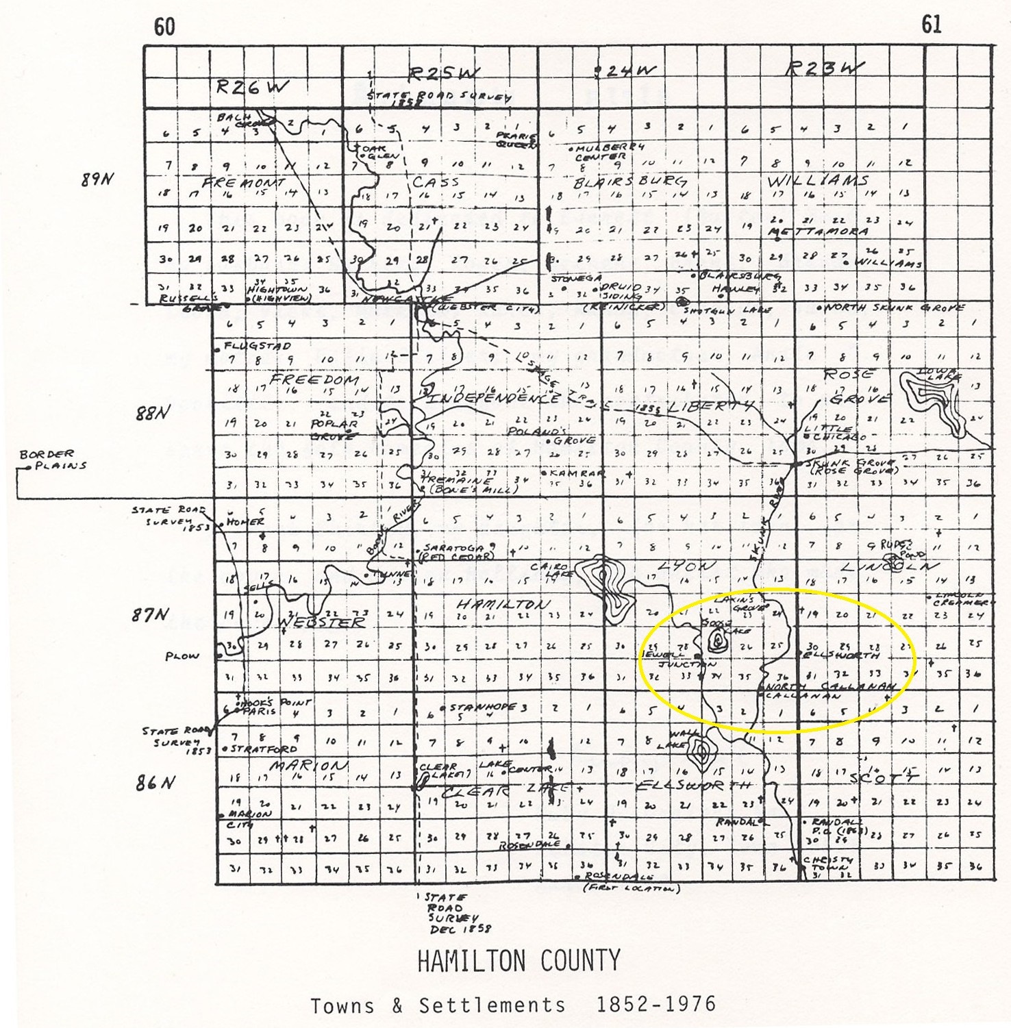 The original Hamilton County of 1856 contained four civil townships.  They were Boone, Webster, Hardin, and Clear Lake townships.  By 1858, Cass township was taken from Boone and by 1860, Hamilton, Marion, and Norway townships were added, making a total of seven.  Between 1860 and 1880, sixteen townships were named.  Hardin and Norway (part of Scott) were discontinued.  Boone township existed only in name, as its boundries are the same as the corporation limits of Webster City.   Thus, our permanent sixteen townships were formed namely: Fremont, Cass, Rose Crove, Webster, Blairsburg, Freedom, Williams, Independence, Liberty, Hamilton, Lyon, Lincoln, Marion, Clear Lake, Ellsworth and Scott.