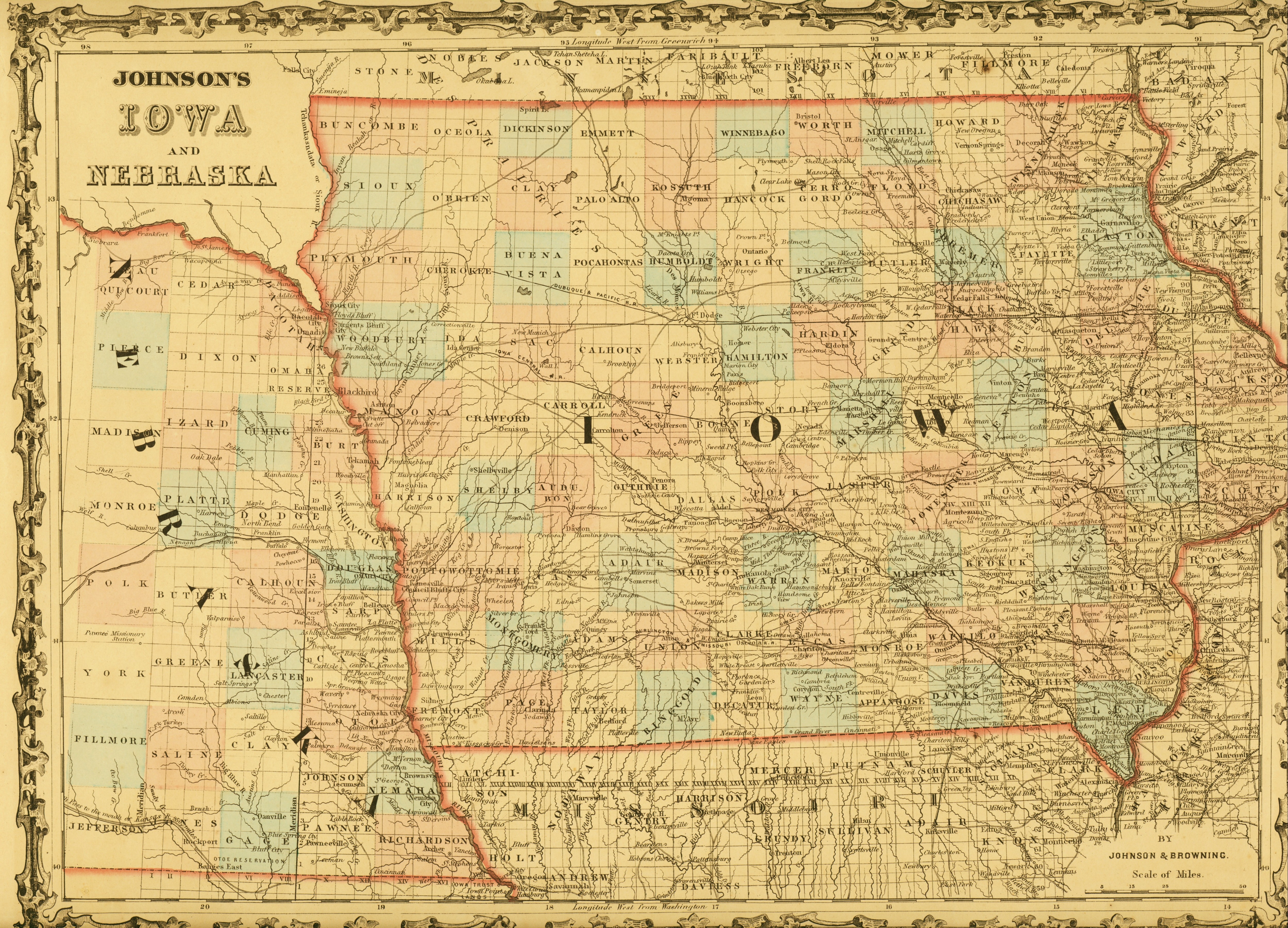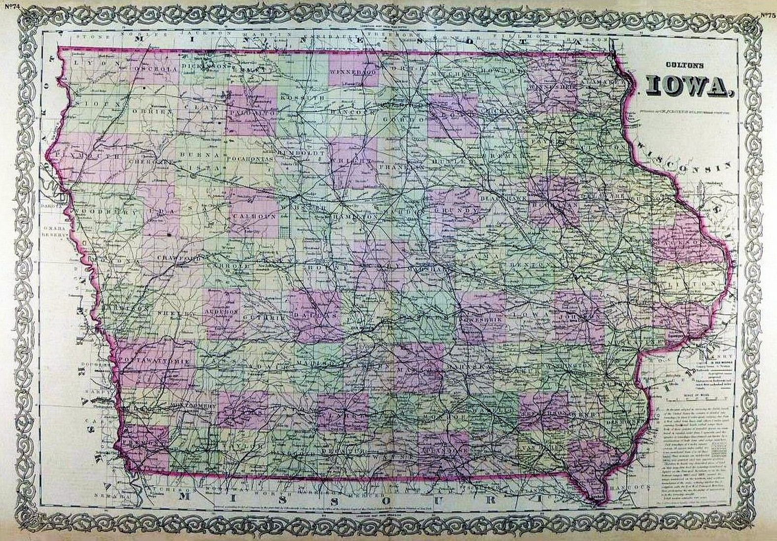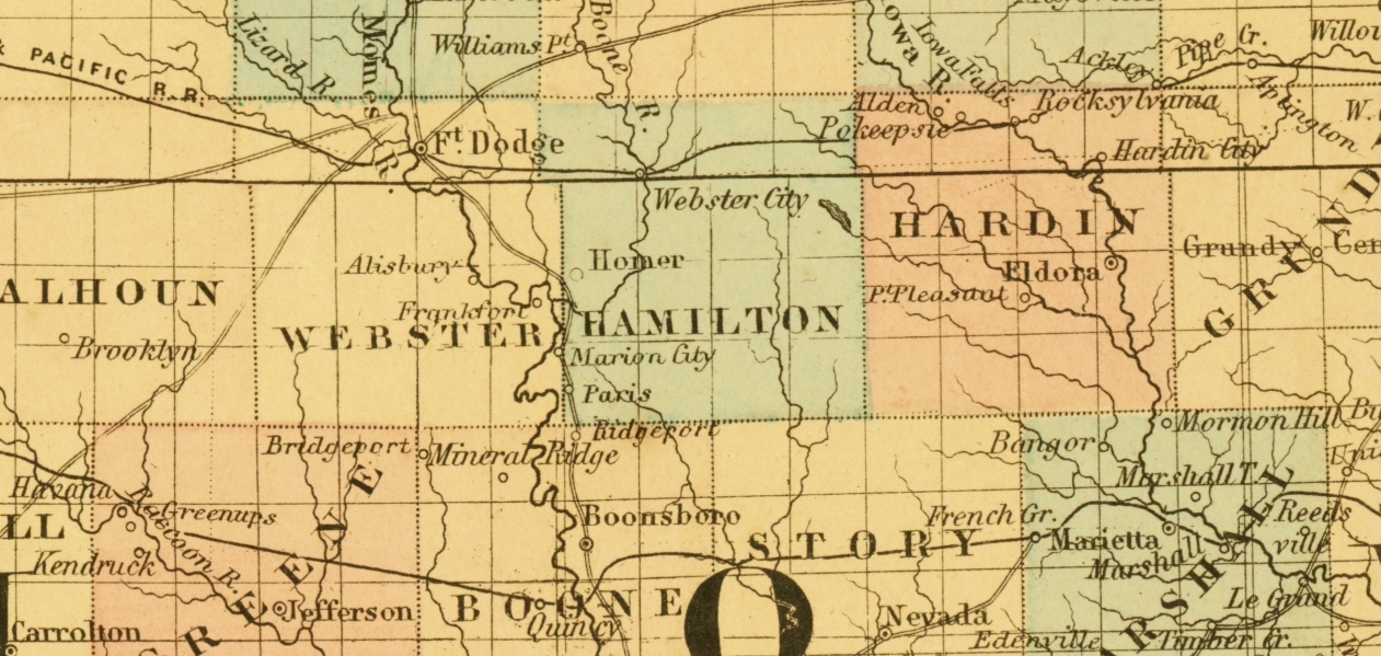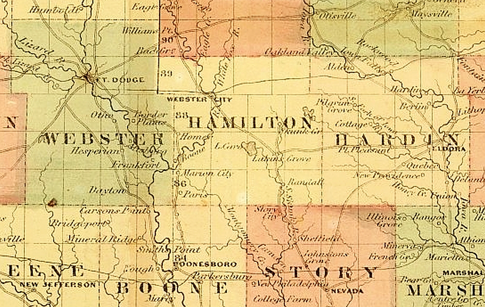 This 1864 Johnson's Map shows Laking's Grove, Homer, Webster City and early settlements of Hamilton County.