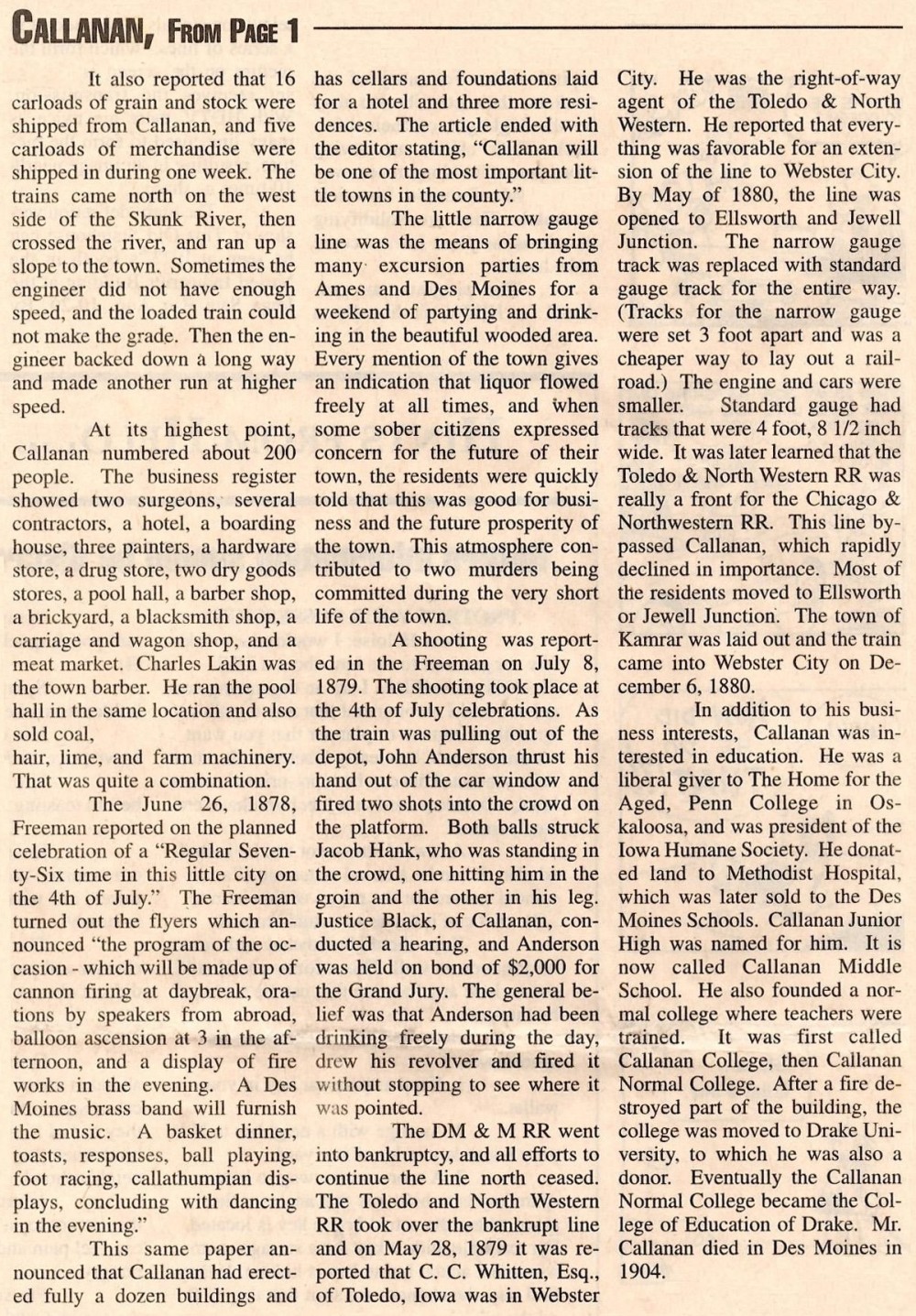 to name the town Callanan to honor the president of the railroad. Callanan