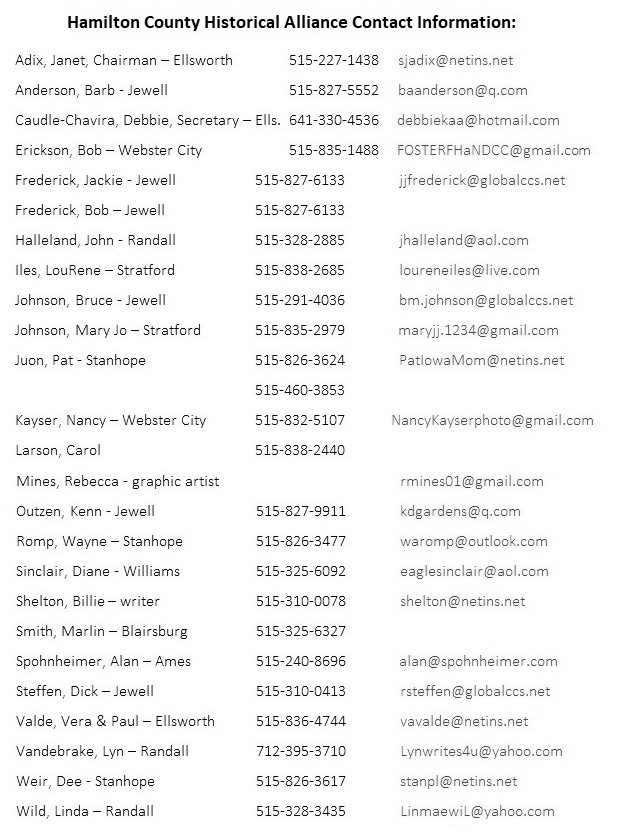 The Hamilton County Historical Alliance holds meetings four time each year. Mary Jo Johnson has offered to host our next quarterly meeting scheduled for April 18. Mark your calendar now. The meeting will be held from 10:00 to 11:00 at her place, 3495 Hook’s Point Drive, Stratford. Learn more . . . Snacks like cookies with coffee, juice, and water are commonly provided. Member Contact info....