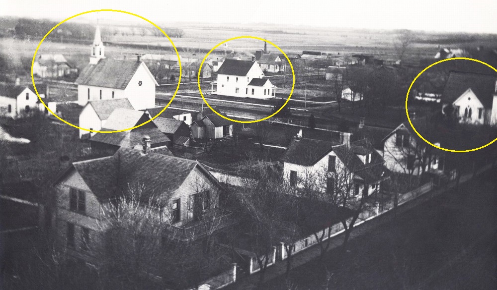 This photo, an aerial photo taken taken by Peter Holt from the belfry of the Lutheran Church in 1904, is now missing three buildings of this neighborhood. The Methodist Episcopal Church seen at left was moved to another location in 1920, the house at center with an address of 1531 Dayton was lost to fire in 2022, and the Methodist church, the former Congregational Church building, was removed in 2025.