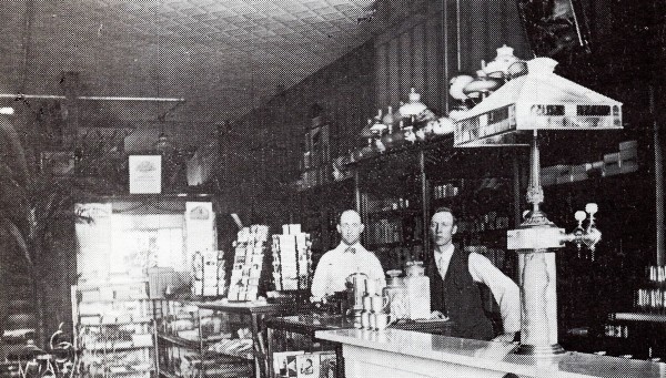 This is the interior of the Peterson Drug Store, with John Peterson and his helper Arthur Arnt on the job.