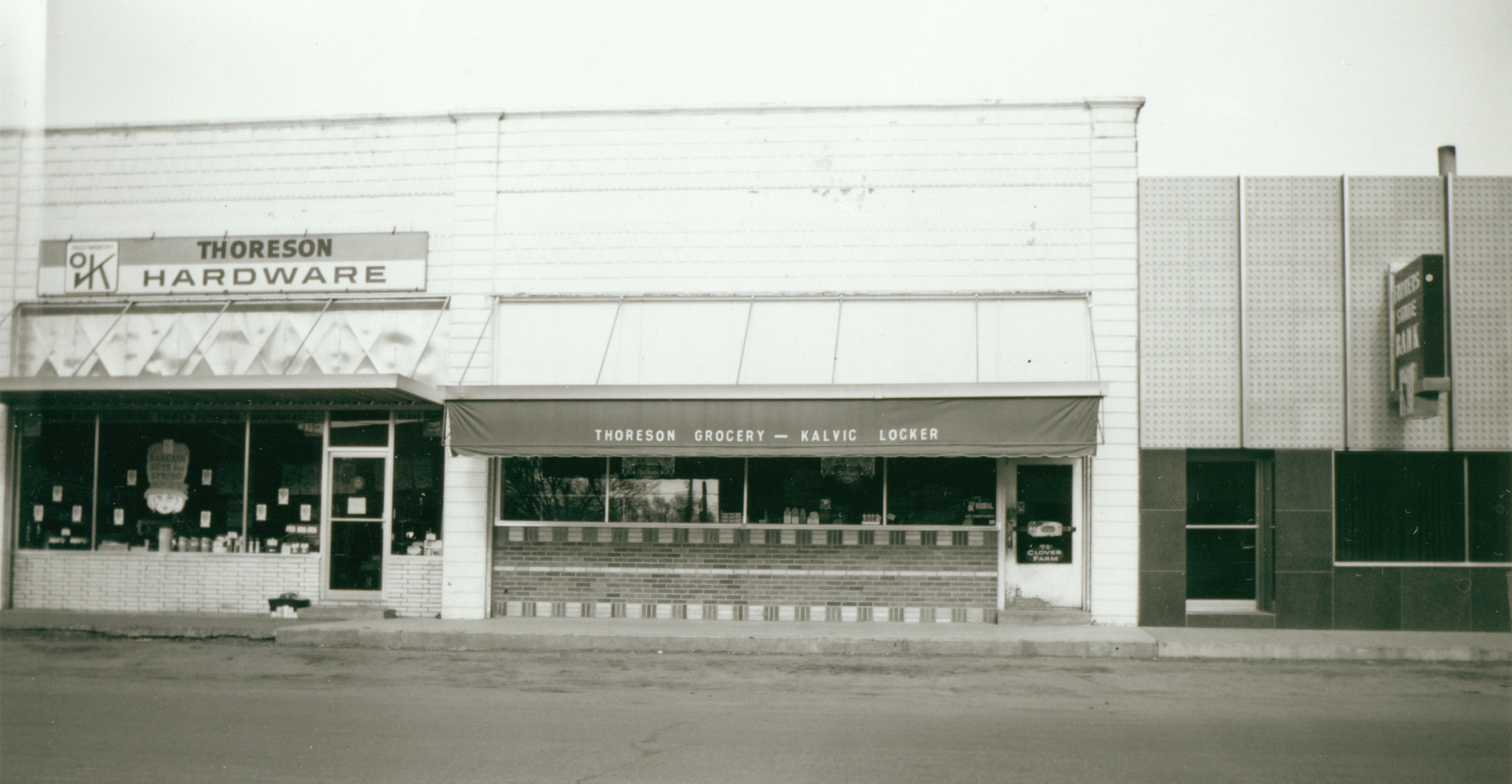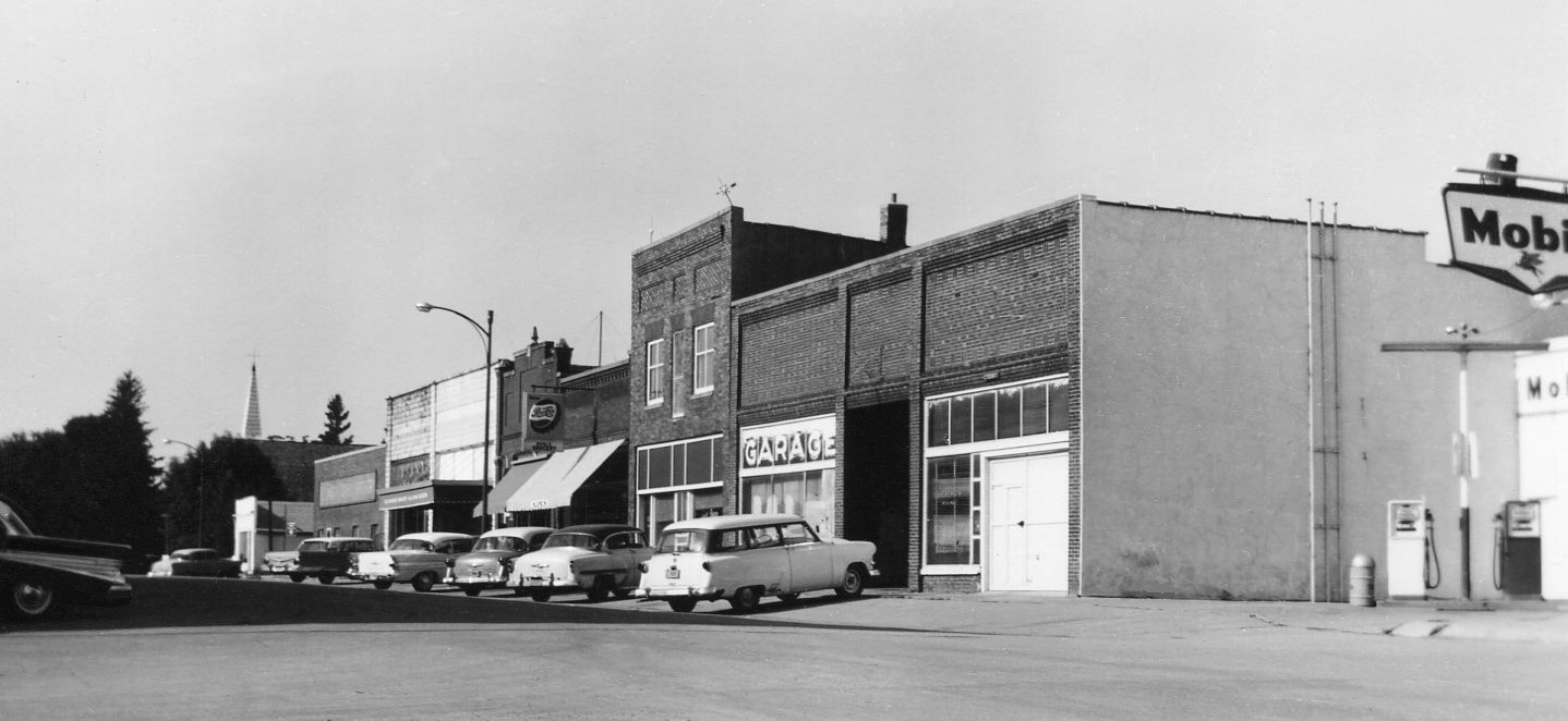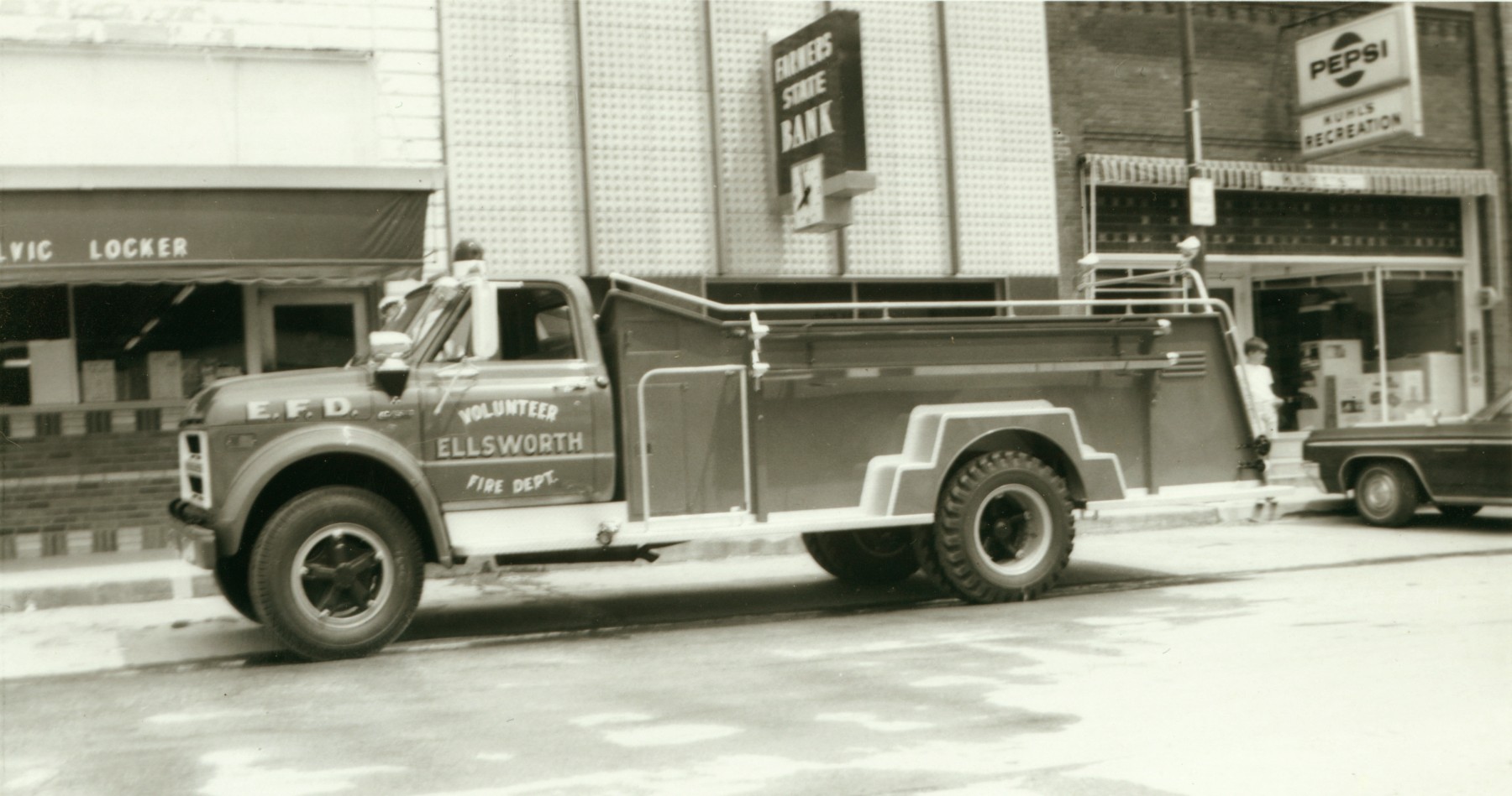 In June of 1969, the Ellsworth Volunteer Fire Department acquired a new firetruck. This 1966 photo shows another view of the east side of Main Street. Thoreson's Hardware Store, the Thoreson's Grocery and Kalvic Locker building,and Farmers State Bank are seen.