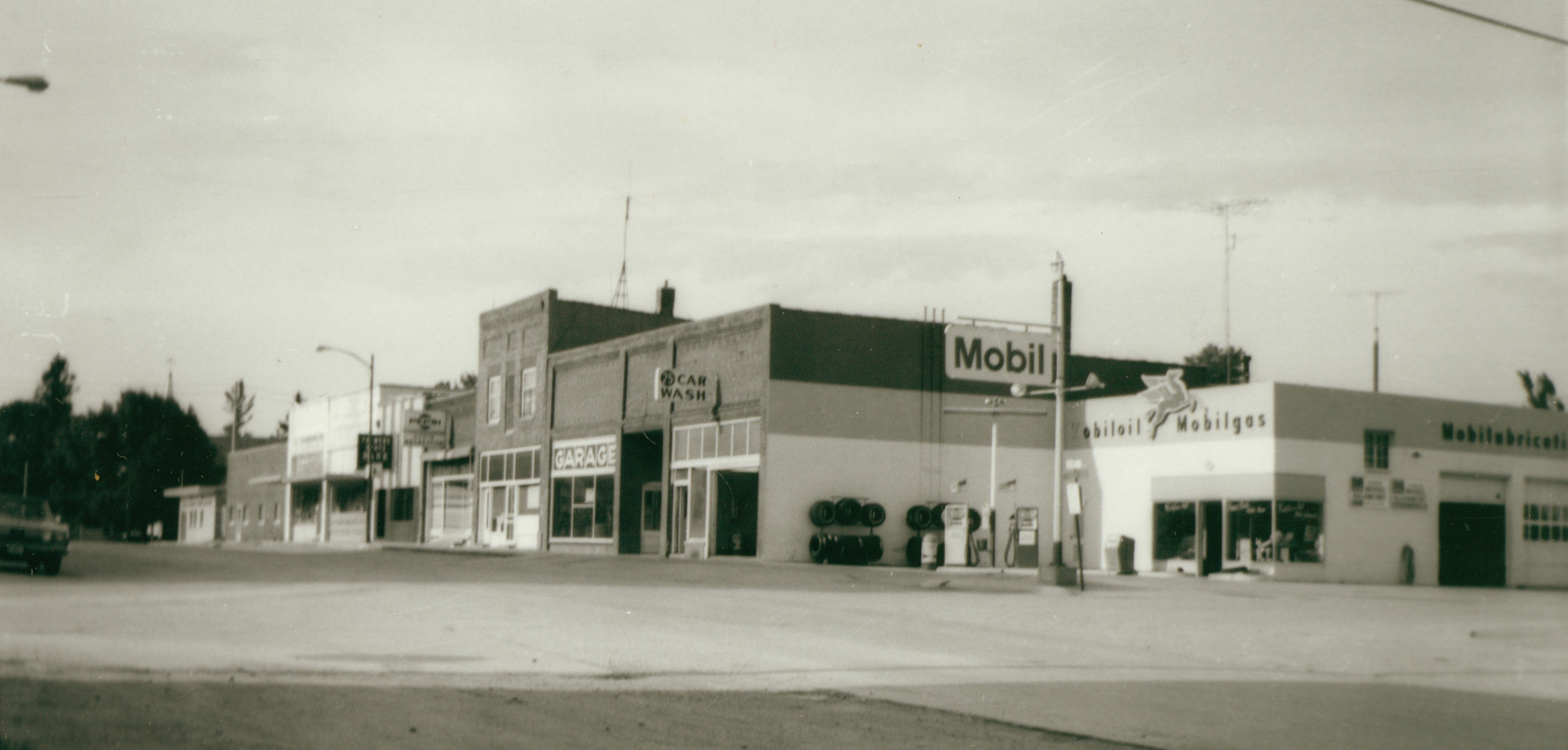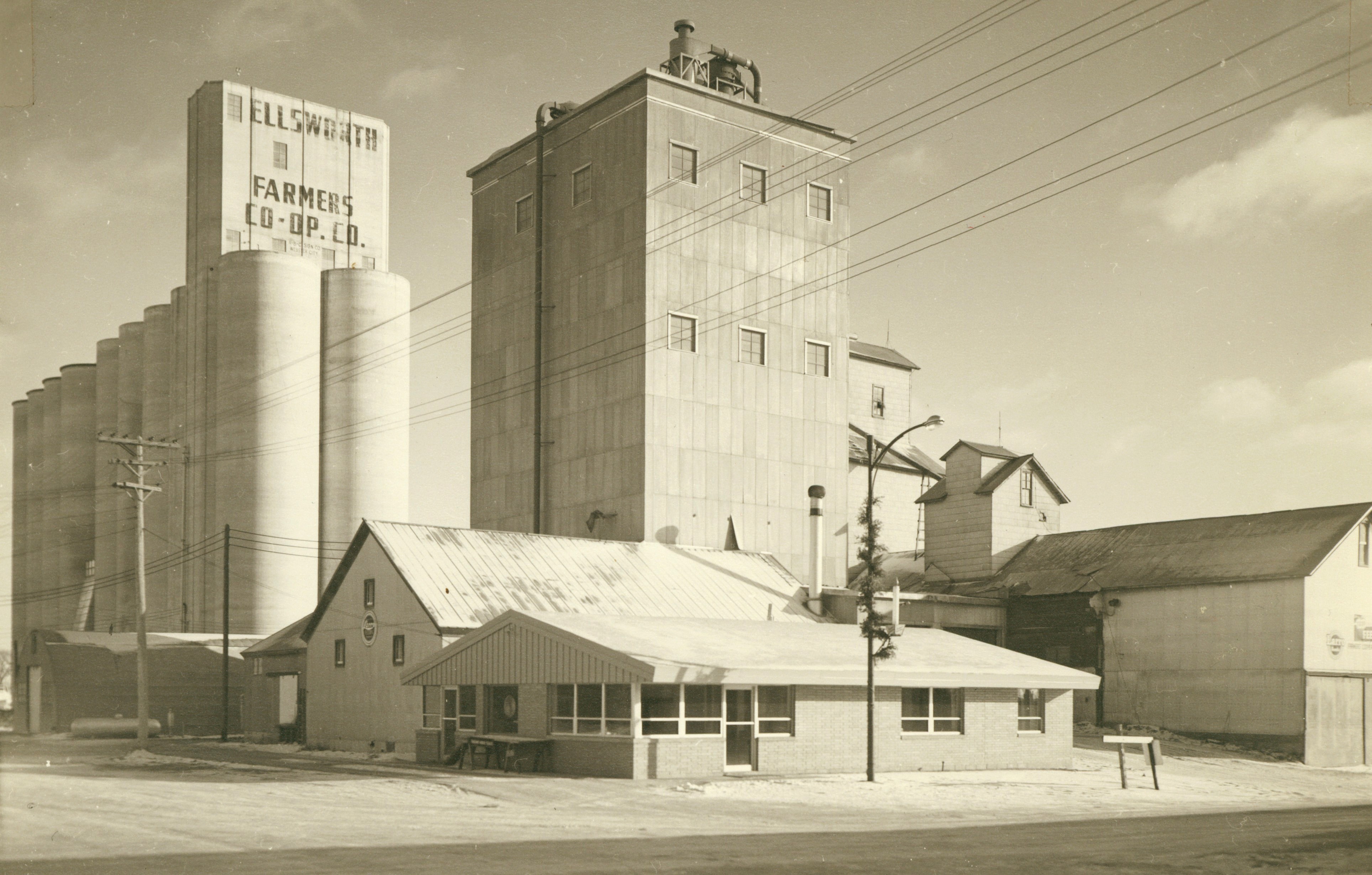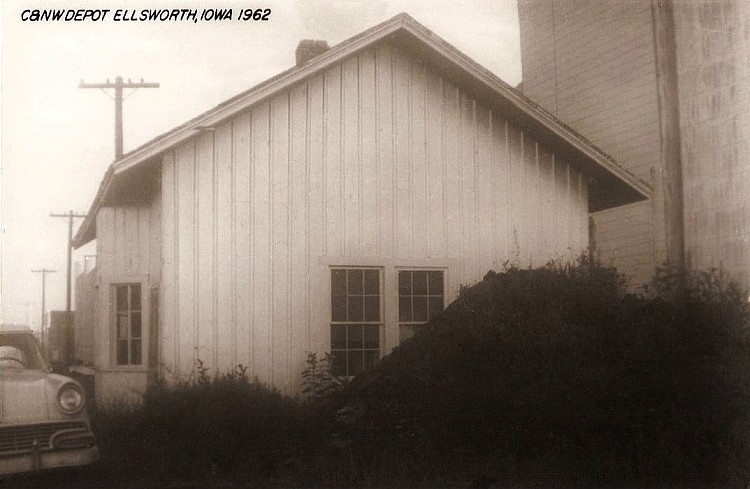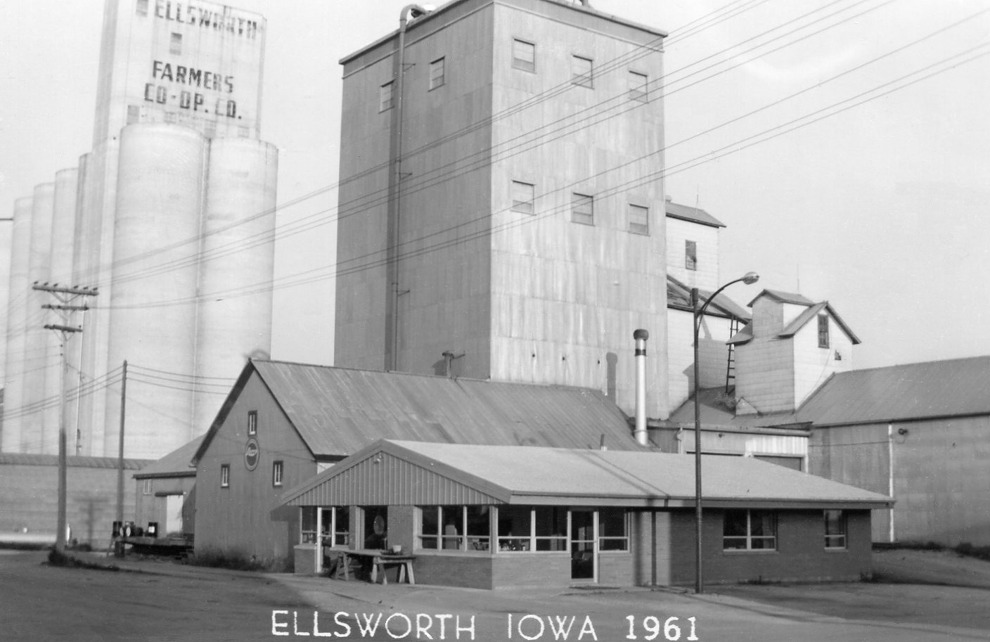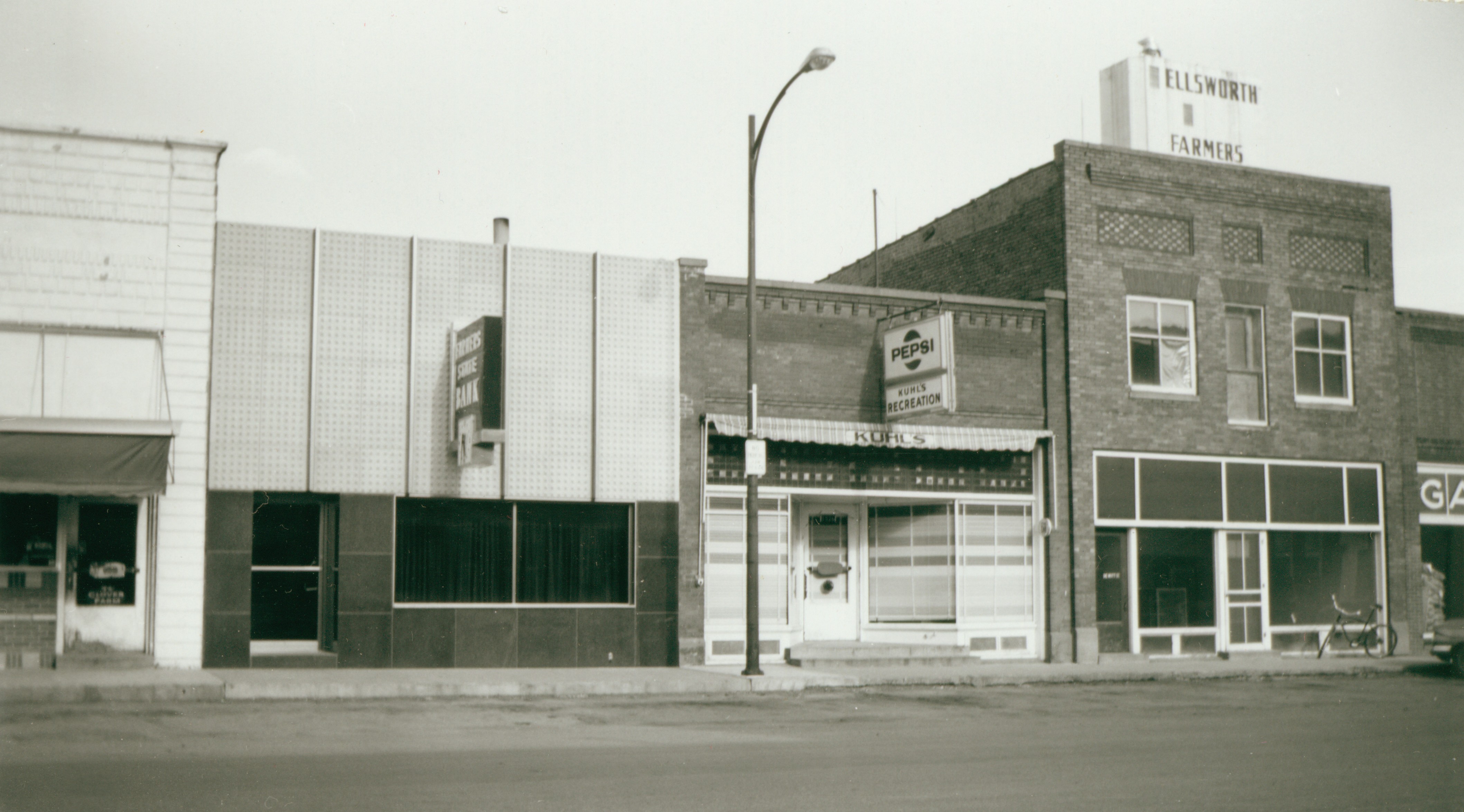 This 1962 grey-scale image of the Ellsworth Depot doesn't allow the red color to show. Of course, the second story was removed in the early 1950s because the station master and his family no longer lived there. The Ellsworth Farmers Co-op and Grain Elevators are seen on the east side of the southern end of Main Street. (Most of these images may be enlarged with a click.) The grain elevators have always been an important part of Ellsworth. The east side of Main Street in 1961 shows Kuhfus Oil