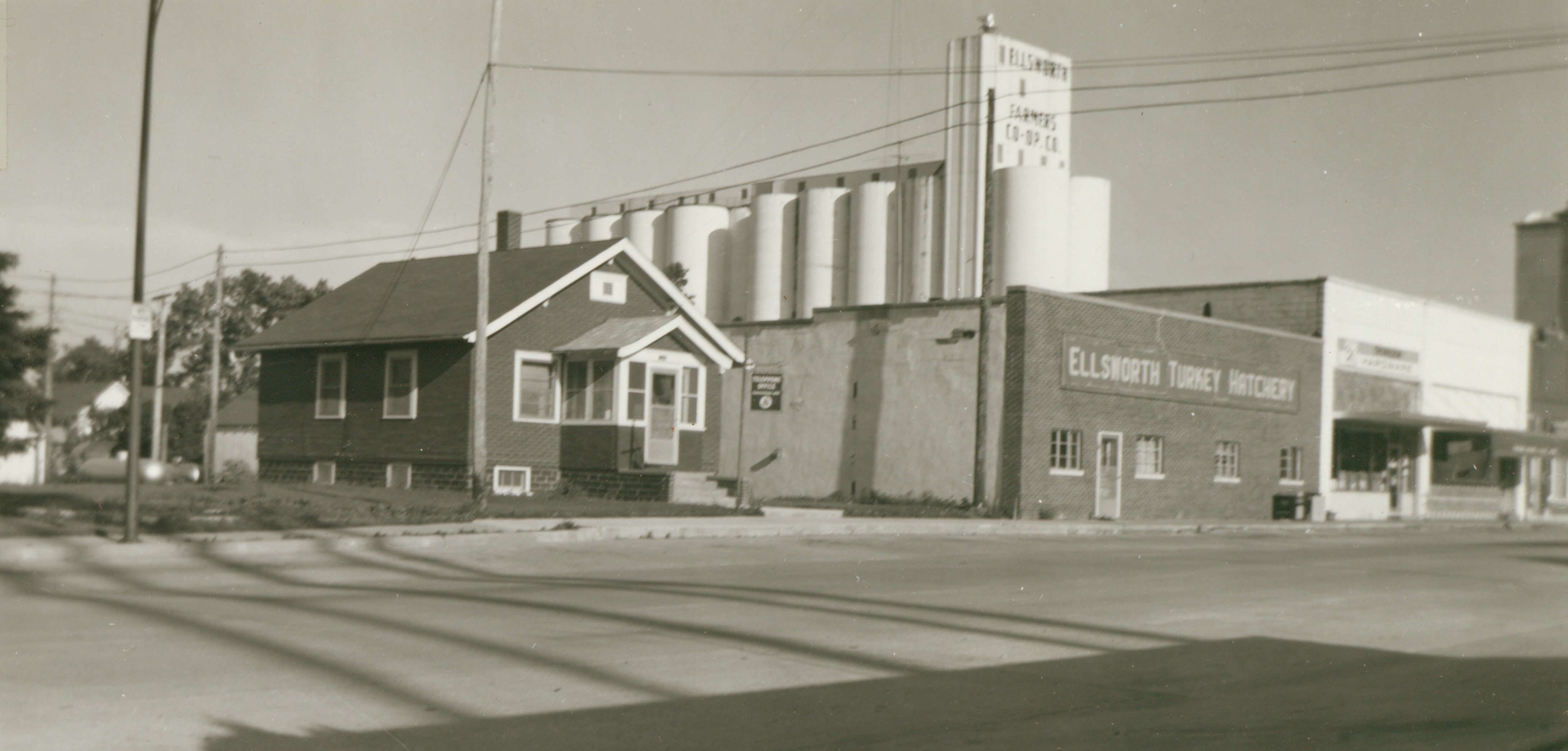 Telephone Offices Here you see the former home which held the telephone switchboard. The sign on the front of this phone building (the telephone office) indicates that the switchboard, seen today in the Library's back room, was used here. At right, the Turkey Hatchery, and Thoreson's Hardware Store are also seen. The former home was later replaced by the new Ellsworth