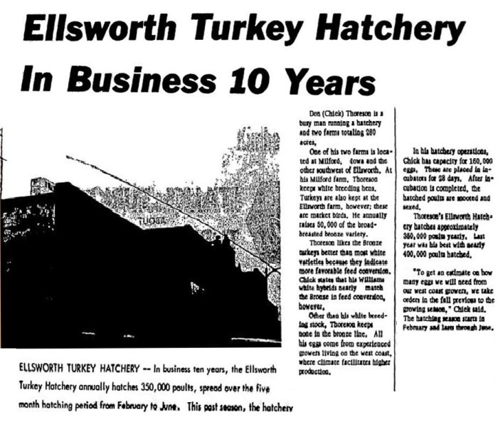Ellsworth Turkey Hatchery In Business 10 Years Don (Chick) Thoreson is a busy man running a hatchery and two farms totaling 280 acres. One of his two farms is located at Milford, Iowa and the other southwest of Ellsworth. At this Milford farm, Thoreson keeps white breeding hens. Turkeys are also kept at the Ellsworth farm, however these are market birds. He annually raises 50,000 of the broadbreasted bronze variety. Thoreson likes the Bronze turkeys better than most white varieties because they indicate more favorable feed conversion. Chick states that his Williams white hybrids nearly match the Bronze in feed conversion, however. Other than his white breeding stock, Thoreson keeps none in the bronze line. All his eggs come from experienced growers living on the west coast, where climate facilitates higher production. In his hatchery operations, Chick has capacity for 160,000 eggs. These are placed in Incubators for 28 days. After incubation is completed, the hatched poults are snooted and sexed. Thoreson's Ellsworth Hatchery hatches approximately 350,000 poults yearly. Last year was his best with nearly 400,000 poults hatched. "To get an estimate on how many eggs we will need from our west coast growers, we take orders in the fall previous to the growing season," Chick said. The hatching season starts in February and lasts through Jane. In addition to hatching birds, Chick is called on to vaccinate flocks for Cholera and other deadly diseases. He handles a complete line of veterinary remedies and bagged feed. Although he has not raised poults on wire, he believes it is the correct method of keeping feet dry and lesion free. "Even if wire is placed around waterers, the cost is three times paid for in the course of agrowing season." Chick feels that a grower should examine his turkey program season by season, especially from a sanitation standpoint. Brooder bouses are the main problem, Chick states. They should be cleaned, disinfected, and dried out before any litter is put down. Chick feels any type of litter may be used, but he feels it must be free of fine particles. Turkeys eat the particles instead of feed. Starve outs are possible. To make sure stoves in the brooder houses are working properly, Thoreson states they should be heated up several days before poults arrive from the hatchery. Everything will be assured of working properly in this manner. In raising his poults, Thoreson places his feeders in a fan around the stoves. This allows the poults to be close without being bunched up behind them. Waterers are placed between feeders. Lights are placed four to five feet above the feeders so the poults can find the feed easily. Brooder guards are used to keep off drafts coming from the floor boards. They are also used to keep the poults confined until they are used to finding the beat. Brooding temperature varies with different stove types. A 95 degree reading from two inches off the floor under the stove is often recommended, Chick states.