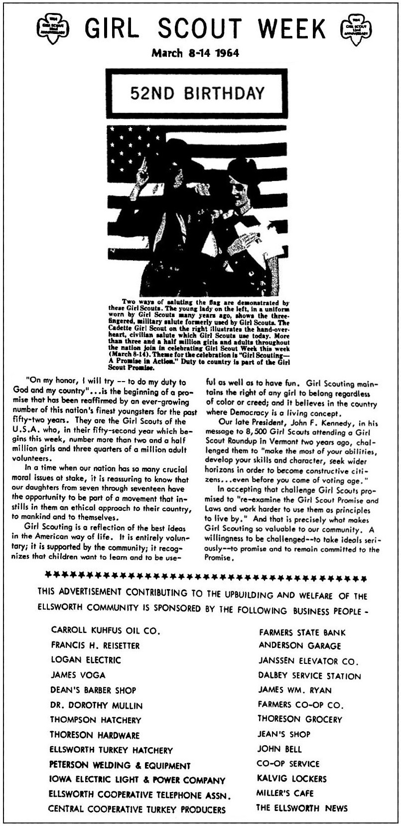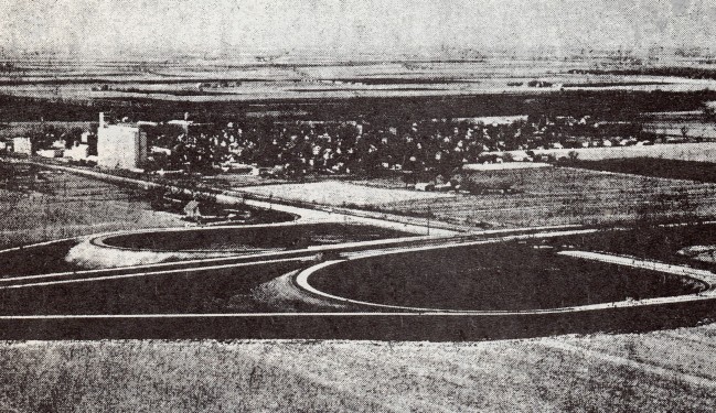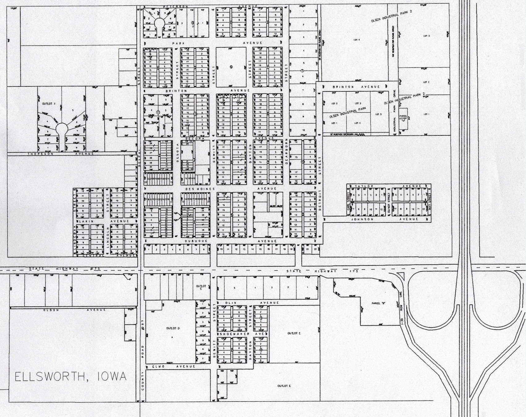 This aerial view of Ellsworth was taken on December 6, 1967, when the new Interstate 35 was opened to traffic. It shows the I-35 and Iowa 175 interchange at the east edge of Ellsworth looking towards the northwest. The half clover-leaf provides for traffice from the four points of the compass.