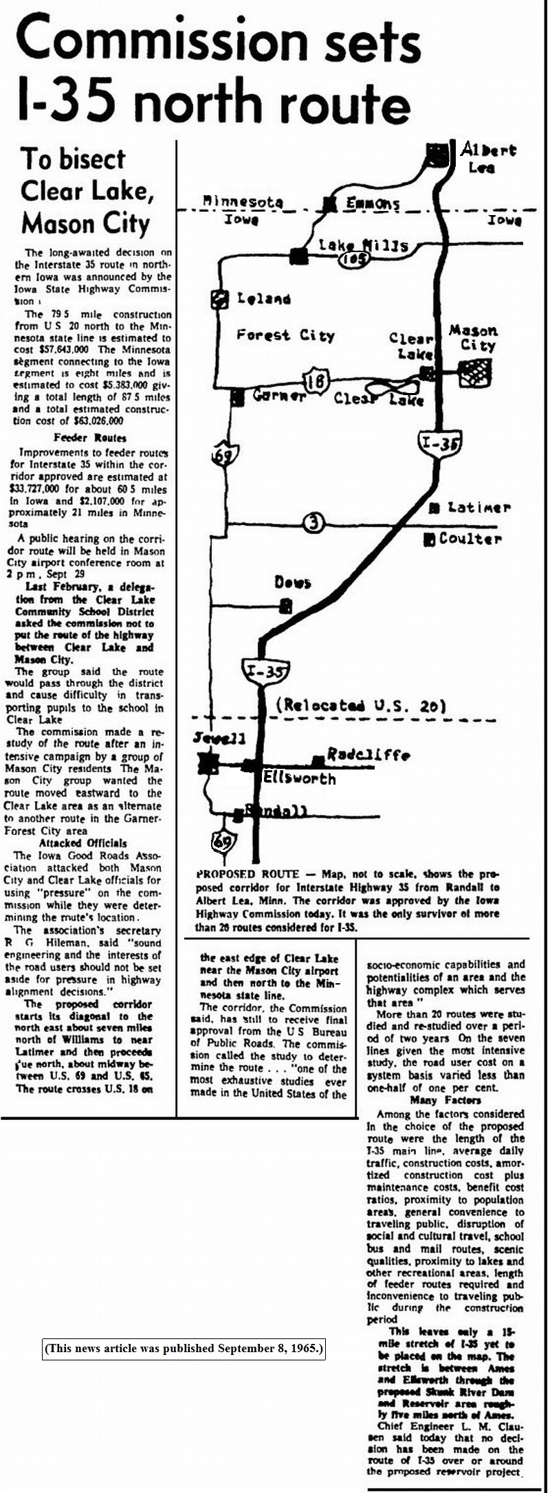 News article from November 11, 1965: A 25 miles segment of Interstate 35 linking Des Moines and Ames will be opened to travic Thurday afternoon, November 11.