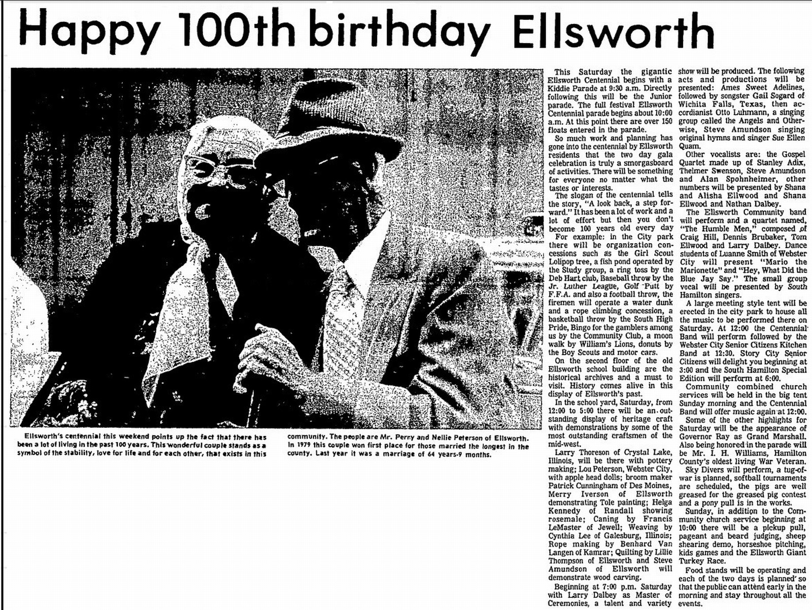 Under the photo: Ellsworth's centennial this weekend points up the fact that there has been a lot of living in the past 100 years. This wonderful couple stands as a symbol of the stability, love for life and for each other, that exists in this community. The people are Mr. Perry and Nellie Peterson of Ellsworth. In 1979 this couple won first place for those married the longest in the county. Last year it was a marriage of 64 years - 9 months.