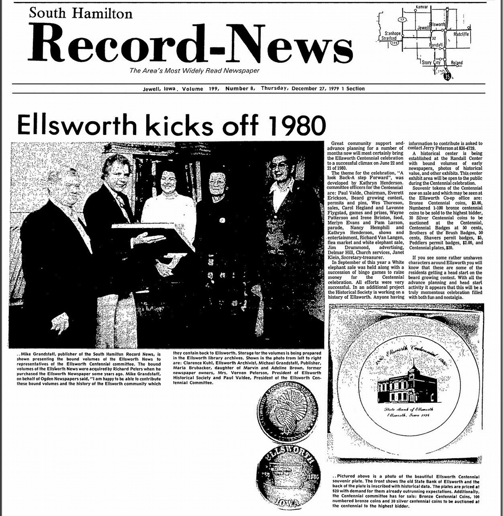 1980 - Ellsworth is 100 years old! The population of Ellsworth in 1980 was 480. Click image for a larger and easier to read version of this Front Page news article.